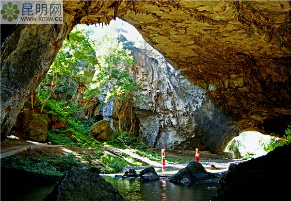 洞中雙飛瀑高達30米,洪水季節(jié)兩瀑合二為一,如一條巨型黃龍,從懸崖上訇然而下,難分雌雄。