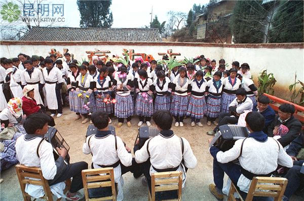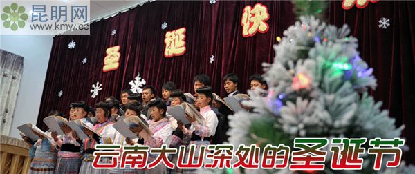 在富民縣小水井村教會,小水井合唱團(tuán)的成員身著節(jié)日盛裝,齊唱贊美詩,迎接圣誕節(jié)的到來。具近百年歷史的小水井苗族合唱團(tuán),近幾年來先后在國內(nèi)外進(jìn)行了多種重大演出,蜚聲海內(nèi)外。