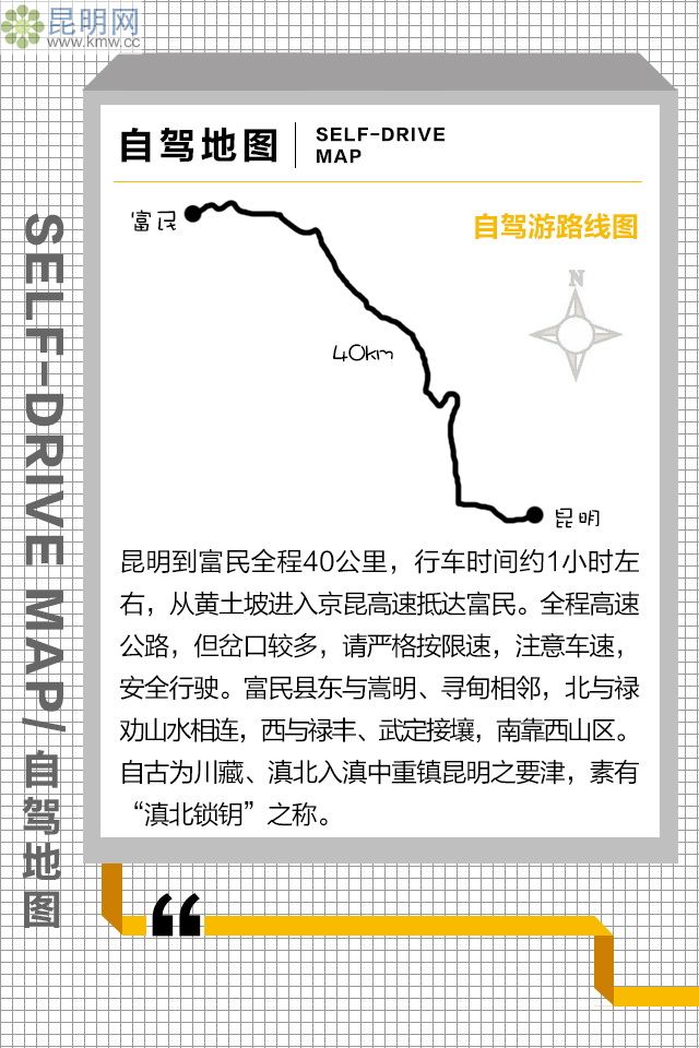 昆明黃土坡轉(zhuǎn)昆沙路,到普吉走昆祿公路,26公里可達(dá)富民。過路費(fèi)8元。由于正在修高速,偶有堵車,路況尚可。