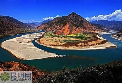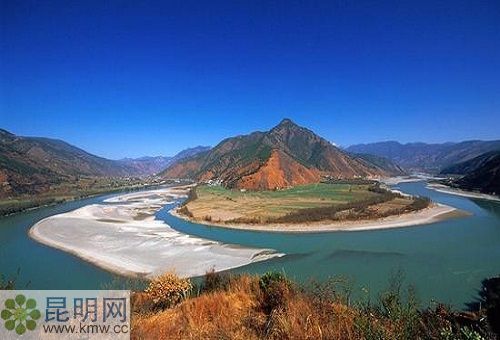 怒江流經(jīng)貢山獨(dú)龍族怒族自治縣丙中洛鄉(xiāng)的日丹寨子附近時(shí),由于千丈懸崖絕壁的阻隔,江水的流向從由北向南急轉(zhuǎn)為由東向西,但流出300余米后, 又被丹拉大山陡坡?lián)踝×巳ヂ罚?只好再次掉頭由西向東急轉(zhuǎn),因而在這里形成了一個(gè)巨大的半圓形的大灣,當(dāng)?shù)乩褰兴?ldquo;火夾”,后通稱為“怒江第一灣”。這里的江面海拔約1700米,氣 勢(shì)磅睛,風(fēng)光搞施。