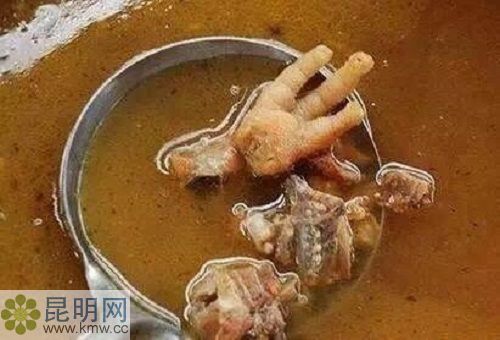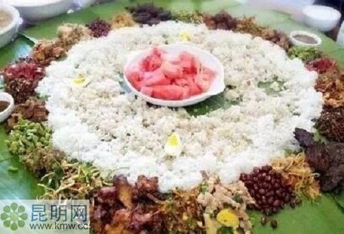 “手抓飯”,是富有傈僳族地方風(fēng)味特色的小吃。其選料的方法是:以本地特產(chǎn)香米煮熟后倒在洗滌干凈的簸箕內(nèi),在米飯上面放切成小塊的黃燜小豬肉、火燒雞肉、熟火腿、油煎土豆、涼拌魚腥草、清煮南瓜及特色佐料,然后盛一碗鮮雞湯放在每一位客人面前。