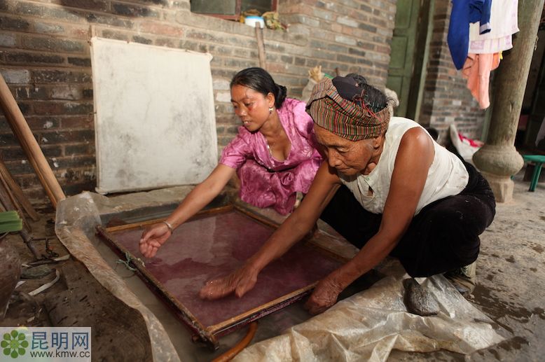 造紙需要收集原材料,每年七、八月間,人們到房前屋后或寨子附近用刀將構(gòu)樹樹干砍倒或?qū)⒋蟮臉渲诚聛恚?xì)心地把樹皮剝下,然后到小河邊把從樹干上剝下來的構(gòu)皮經(jīng)水洗去粘液,再用小刀把外面那層黑色的外皮全部刮掉,只留下里面白色的嫩皮,樹皮剝好后,就在小河邊進(jìn)行第一次清洗,這時(shí)必須將黑色外皮處理干凈,否則會(huì)影響紙的質(zhì)量。清洗完后挑回家進(jìn)行第二步工藝流程即纖維的分離,將清洗好的構(gòu)皮上火塘灰、灶灰,使植物纖維原料分散成纖維狀,火塘灰先用篩子將火塘灰過篩,去掉火炭及其他雜物,然后將泡軟的構(gòu)皮置于其中,讓火灰均勻地附著在構(gòu)皮上(火灰的質(zhì)量與所燒木柴有關(guān),木柴質(zhì)地越好,火灰的堿性就越強(qiáng)),使構(gòu)皮得到充分的堿化(火灰的堿性還與紙的質(zhì)量有關(guān),堿性越強(qiáng)紙就越白),然后將已經(jīng)上灰的構(gòu)皮置于已盛水的鍋中,蓋上麻布,用中火蒸煮。不管時(shí)間長短,只要構(gòu)皮煮透了就行。