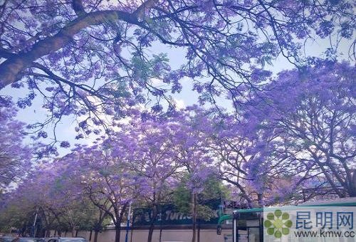 每年春夏之交的昆明,藍花楹是昆明街頭最美麗的花卉之一,錐狀紫色花序配上羽狀復葉,花雨飄落顯得浪漫十足,跟其花語“在絕望中等待愛情”一樣富有詩意。昆明最具特色的藍花楹景觀道,便是從學府路口順教場中路走,一直到二環北路入口一段約2公里的路段上。數百株藍花楹在這條道路上作為行道樹,長勢良好,樹的胸徑基本達20厘米,已形成一條全國聞名的藍花楹景觀林蔭大道。