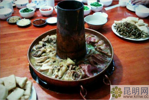 大家圍坐在圓桌周圍,看著熱氣從鍋邊“噗噗”冒出,就已直咽口水。廚師把白菜、豆腐、粉絲、蓮藕、木耳、香菇等食材一層一層鋪在鍋底,緊接著有序地把云腿片、五花肉片、雞蛋卷鋪蓋在上層,再把肉湯倒進鍋中,為了讓銅炊鍋里的菜品更有味,再撒上草果、胡椒粉,然后蓋上蓋子,中間圓筒里放進燒紅的木炭,進一步烹煮滿滿一鍋的食材。當食客打開銅炊鍋蓋子,一陣陣香氣撲鼻而來;再看看鍋里各色誘人菜品,頓時勾起人的食欲。由于銅炊鍋里所煮的菜品較多,鍋中的湯不僅美味鮮甜,且營養豐富。