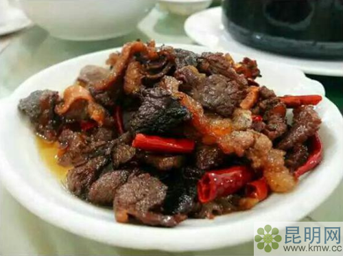 沙甸當地人會在秋冬時節選用肥壯肉牛后腿等部位的優質牛肉,輔之以食鹽等調料,采用搓揉、腌漬、晾曬、風干等工藝,加工制做成牛干巴。再把切得厚薄適度的牛干巴用油淹沒,翻炒后放入干辣椒段,炒至牛干巴變色、香氣外溢,連同食用油一起放入容器中封裝,這便成為沙甸的一道美食——油淋干巴。