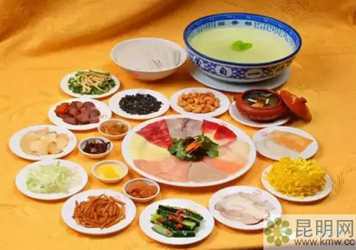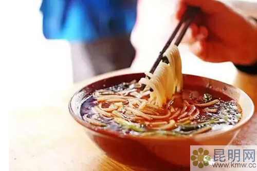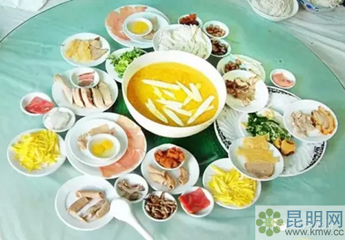 進餐時,以大"海參碗"盛湯,加味精、胡菽、熟雞油。湯滾油厚,不冒一絲熱氣。湯上桌后,將鴿蛋磕入碗內,繼而將肉片氽入湯中,輕輕一攪,霎時變得雪白、細嫩。然后再放入鮮菜、米線,配上辣椒油、芝麻油等,便可食用。米線品種甚多,吃法多樣,既可熱吃,也可涼吃,可葷可素,豐儉由人。
