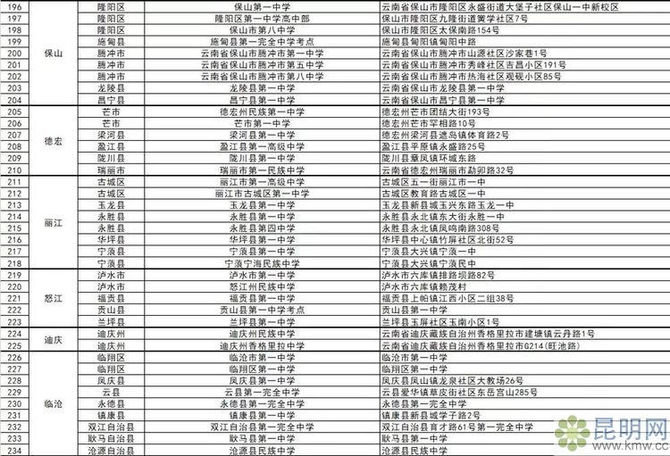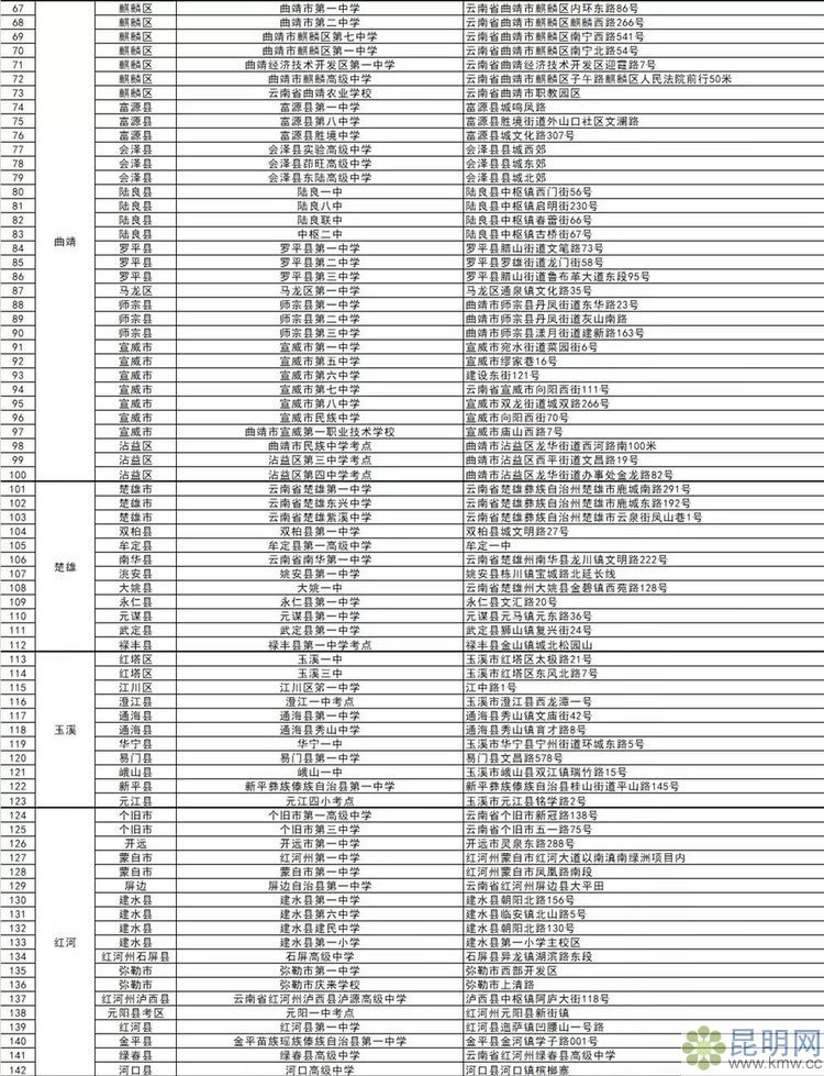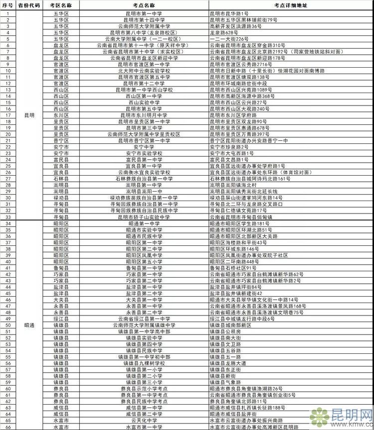 特別提醒,考生要仔細辨別考點學校名稱,提前確認考點位置,以免出現走錯考點、耽誤考試的情況發生。昆明各考點也將在考前1天開放,考生可提前到考點學校熟悉周邊道路、環境情況?键c具體如下: