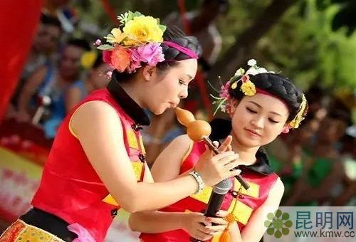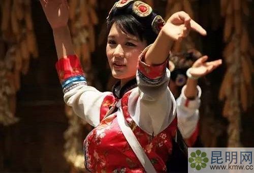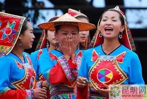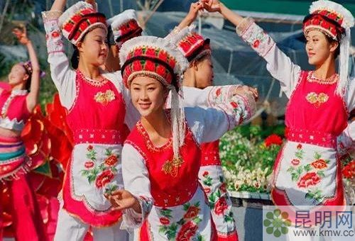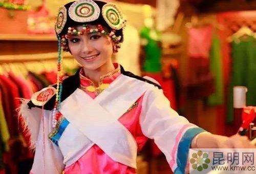 在白族姑娘的頭飾上,蘊含著一個大家非常熟悉的詞語,它就是:風花雪月。解釋:白族少女的帽子,垂下的惠子是下關的風;艷麗的花飾是上關的花;帽頂的潔白是蒼山雪;彎彎的造型是洱海月。