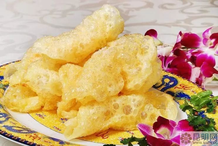 炸乳扇,這是乳扇較為普遍的吃法,即把乳扇放入油鍋內煎炸片刻,待乳扇呈焦黃色后取出放入盤內,撤上白糖或椒鹽即可食用,吃起來芳香酥脆,鮮美可口。乳扇外形像我們常吃的炸蝦片,但與蝦片不同的是乳扇入口后有些微酸,焦脆可口、奶香濃郁,風味獨特、滿口余香。