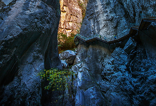 在峽谷的棧道上,抬頭仰望,兩翼群峰直通天際,懸崖峭壁直劈河中;望腳下,河水奔流,綠波拍岸。棧道上行走可與水聲相伴,宛如仙翁俠客穿越在深峽中的水面上。