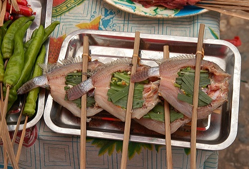 香茅草烤魚是傣族的特色菜,用當(dāng)?shù)厣L的青竹片夾住被充滿獨(dú)特香味的香茅草和香菜腌制過的魚,用明火烤。魚肉外層香脆,內(nèi)層鮮嫩又富有滋味,一定別錯過!