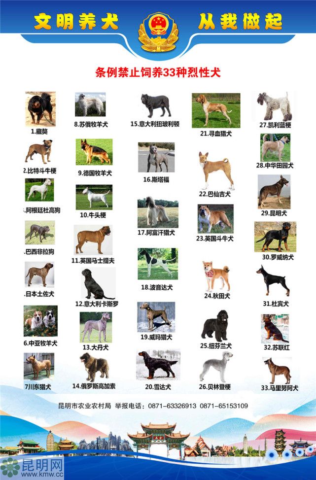 據(jù)了解,早在2008年昆明頒布實(shí)施的《昆明市養(yǎng)狗管理?xiàng)l例》,對市民圈養(yǎng)和收容各種犬有了明確規(guī)定。《條例》生效后,確認(rèn)這33種烈性犬不能在主城區(qū)內(nèi)飼養(yǎng):